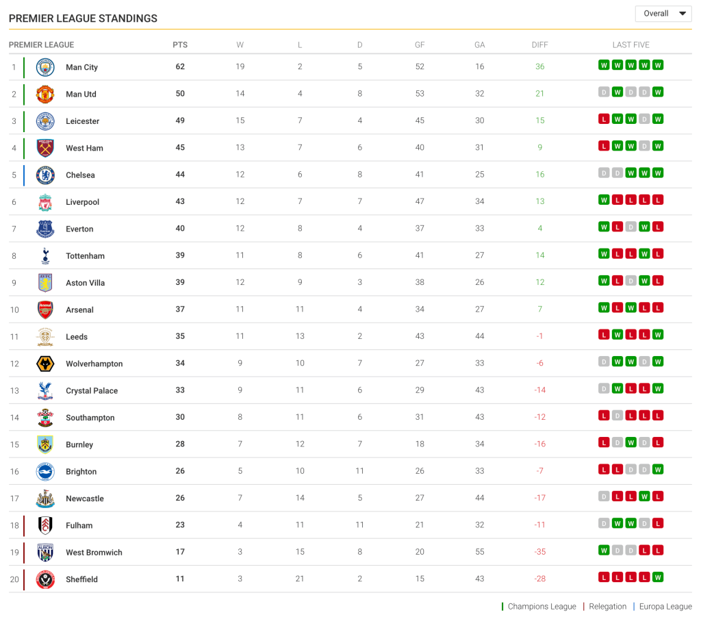 View the latest premier league tables, form guides and season archives, on the official website of the premier league.